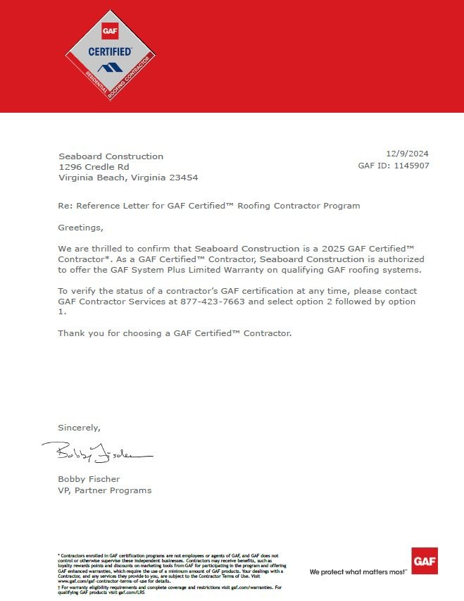 Seaboard Construction has been the Chesapeake, VA area's reliable residential roofing, construction, and remodeling partner for years, delivering quality craftsmanship with care. Our skilled team combines years of experience with personalized service to build living spaces you'll love. As a licensed and insured Class A contractor, we uphold strict quality and safety standards throughout every project.